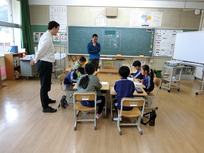 写真上:ALTとの授業です。「My name is 〜.」「I like 〜.」と自己紹介ができるように、文字やイラストで自己紹介カードをかいています。ALTはバドミントン、ゲーム、とんかつが好きだそうですよ。