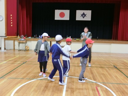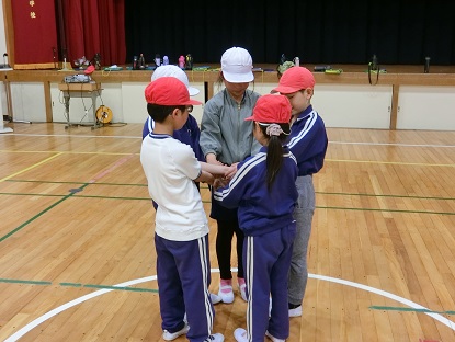 写真中・下:体育の授業の様子です。「人間ちえの輪」に挑戦です。初めに隣ではない人と右手をつなぎ、次に隣ではない人と左手をつなぎます。「○○ちゃん、ここくぐって」「くるっとひっくり返って」「あー、手が痛い」みんなで知恵を出し合い、大成功!