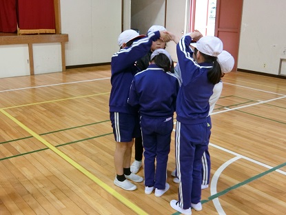 写真下:体育の授業で、「人間ちえの輪」に挑戦しています。みんなで相談しながら、最後はしっかり一つの輪になることができました。