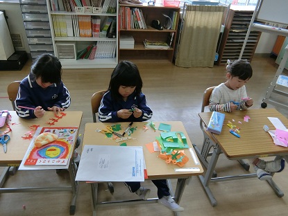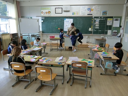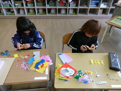 図画工作科「ちょきちょきかざり」の学習です。折り紙を折って重ねたまま切り、シンメトリーの模様や人型がつながった模様を作ったり、七夕飾りに使われる「天の川」や「ちょうちん」などを作って楽しみました。「ここをもっとたくさん切ってみよう」「こうしたらうまくいくかな」試行錯誤を繰り返して、集中して取り組んでいました。