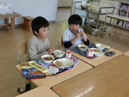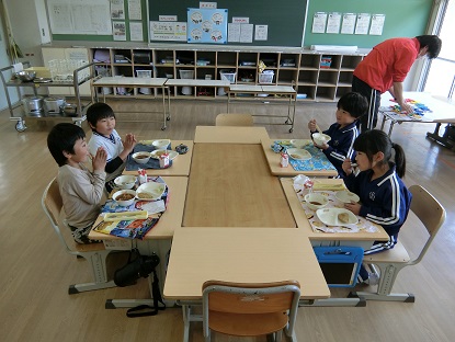 給食の時間の様子です。「おいしいですか」「おいしすぎる〜」