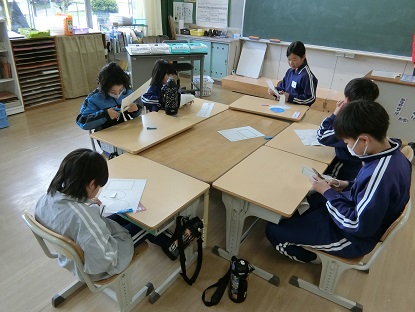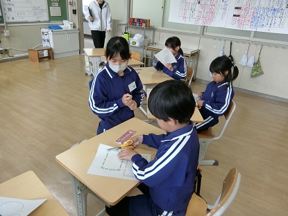 アドベンチャー終了後には、みんなで振り返りの掲示物を作るのが恒例です。当日帰ってきてから書くための、カードの準備をしています。ここでも6年生が「みんな(用紙は)ある?」「ここを切ればいいんだよ」と、下級生を気遣います。