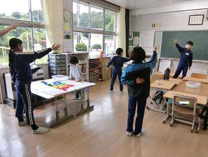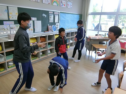 写真上:「だるまさんが転んだ」の様子です。「走ると危ないから、早歩きまでね」6年生がしっかり指示を出しています。