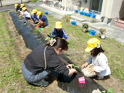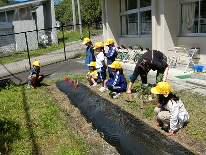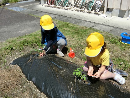 生活科の授業の様子です。夏野菜の苗を植えました。「夏野菜」と聞いて「キュウリ、トマト、ナス」とすぐに答えることができました。今日はその他にも、ピーマン、トウモロコシの苗を植えました。「とまちゃんにする」「これはプチトマトちゃん」と、それぞれ名前を付けていました。おいしい野菜ができるように、これから世話をしていきましょうね。