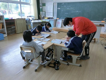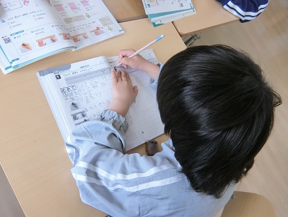 算数科で直線のかき方を学んでいます。まず、1つ始点となる点をかき、定規で長さを測って終点となる点をかきます。最後に定規で2つの点を結べば出来上がりです。みんな定規を使って、正しく直線をかくことができました。