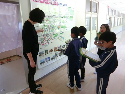 社会科で豊田市について学んでいます。今日は、豊田市の鉄道がどの辺りを通っているか、廊下にある大きな地図で確かめにきました。豊田市の西の方に愛知環状鉄道を名鉄が通っていることを確認しました。