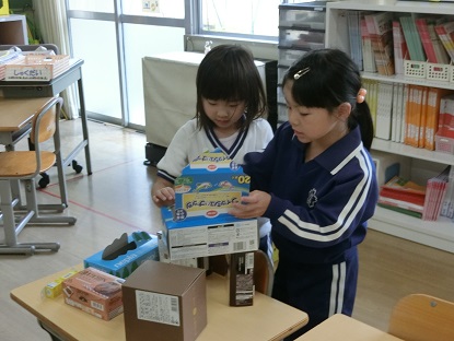 算数科で「はこのかたち」を学習しました。今日はいろいろな大きさ・形の箱を使って、それぞれ作りたいものを作っています。