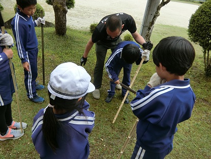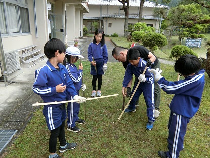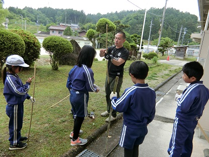 弓の製作が着々と進んでいます。今日は一人分ずつ細く切り分けた竹の「節」をなたで切り落としています。担任の丁寧な安全指導の下、みんな「自分でやりたい」と挑戦しました。すでに「自分の弓」に愛着を持ち、名前を書いて大切に扱っている3年生です。