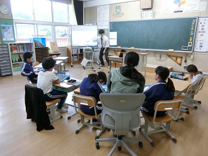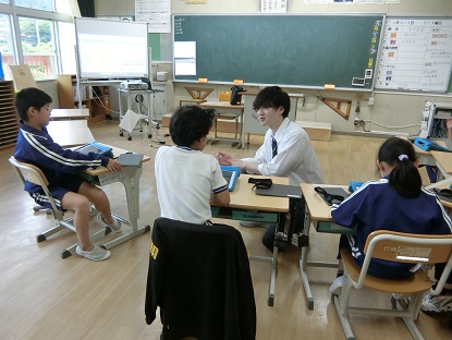 ICT支援員による授業の様子です。今日は、プログラミングをしています。3年生までに学習したことがしっかり身に付いていて、「こういうときは、どうするんだった?」と聞かれると、すぐに答えることができました。正しく指示し、思い通りに画面の中の「ペット」が動かせると、「やった!」と歓声が上がっていました。