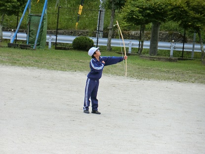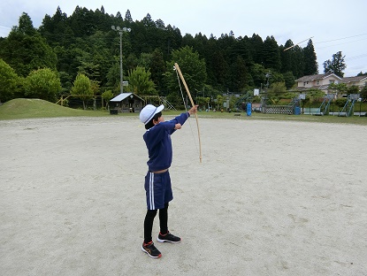 写真中・下:3年生の弓が出来上がりました。矢もとてもよく飛びます。みんな「自分の弓」に満足そうな様子でした。