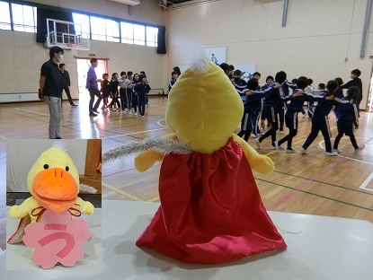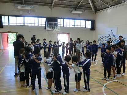 今年度最初の「全校音楽」を行いました。今月の歌は「さんぽ」です。縦割り班ごとに「電車」を作り、歌いながら歩きます。1番が終わったところで近くの電車とじゃんけんをして、負けた方は勝った電車の一番後ろに連結します。最後には全校みんなで一つの長い電車になりました。