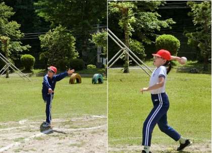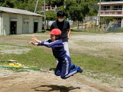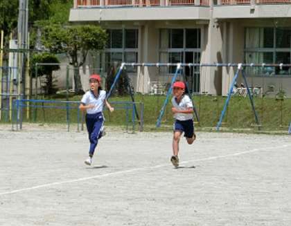 体力テストの様子です。お互いにアドバイスを合いながら、友達の記録が伸びると一緒に喜ぶ素敵な5年生です。