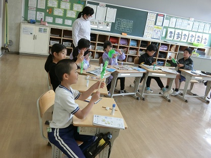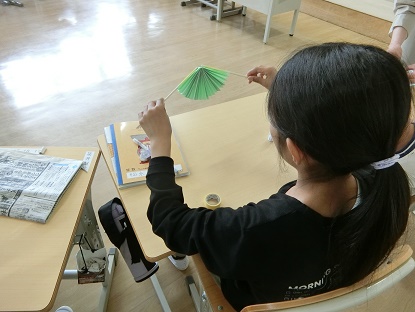 5月29日(木)4年生 今日の様子 公開日 2025/05/29 更新日 2025/05/29 お知らせ 算数科「角とその大きさ」の授業の様子です。角の大きさをイメージするために折り紙と割りばしを使っておうぎを作りました。「このくらいが直角かな」「45度は90度の半分だからこのくらいかな」と、自分のおうぎを操作していました。これから、180度を超える角度についても学習していきます。