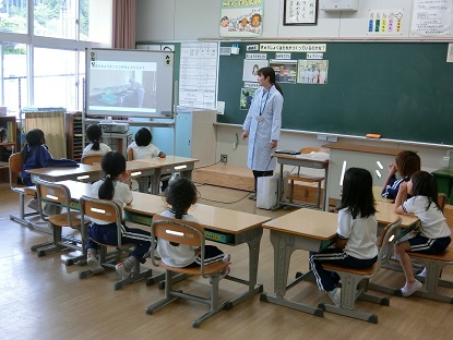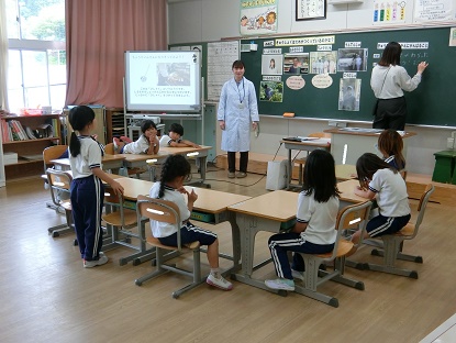 旭中学校の栄養教諭をお招きして、栄養指導「きゅうしょくはだれがつくっているのかな」を行いました。毎日何気なく食べている給食ですが、献立を作る栄養士さん、野菜などの食べ物を作る人、お店の人、調理員さん、運んでくれる運転手さん、教室まで運んでくれる公務手さんや配膳員さんなど、たくさんの人のお世話になっていることがわかりました。
