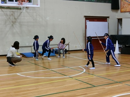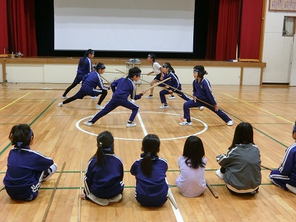 本日から、運動会での発表に向けて棒の手練習を開始しました。あいにくの雨で、運動場では行えませんでしたが、体育館に集合し、教務主任より運動会で発表することや今後の練習についての話を聞いた後、各流派ごとに分かれて練習をしました。今日は初日なので、5・6年生がお手本となる型を披露した後、個々に下級生に教えてくれました。