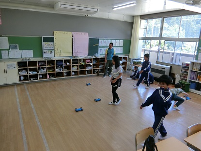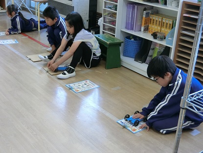 理科「ゴムと風に力のはたらき」の学習の様子です。ゴムの力で動く車を作り、ゴムの力を自分でコントロールして、ゴールにぴったり止める活動をしています。ゴムを長く伸ばしすぎると、ゴールを超えてしまします。逆に短すぎるとゴールに届きません。何度も行ううちに、加減が分かってきた子どもたち。この後、ぴったり止めることができたようです。