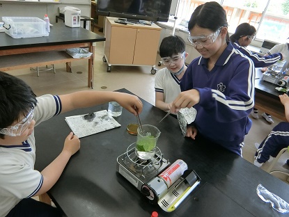 理科「植物の体のつくりとはたらき」の学習で、成長と日光の関わりを調べる実験をしています。日光が当たった葉と日光が当たらにようにした葉を用意し、数分間ゆでて柔らかくし、ヨウ素液につけて葉にでんぷんがあるかどうかを調べます。