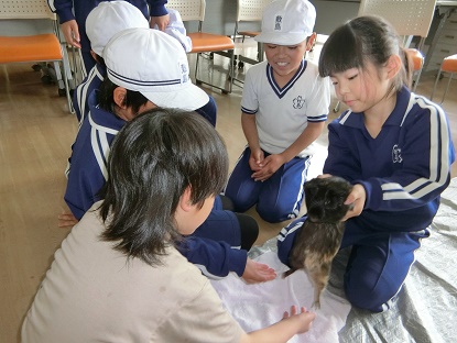 今日は、2年生が全校朝会で学年発表を行いました。先週から飼育しているモルモットのはづきちゃんについて、性格や世話の仕方など、動物愛護協会の方に教えていただいたことを発表し、はづきちゃんと触れ合う時の注意事項を説明しました。