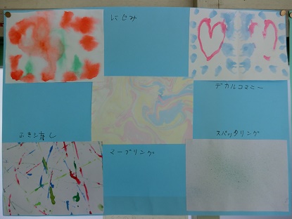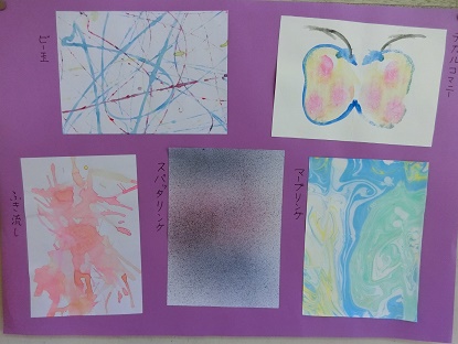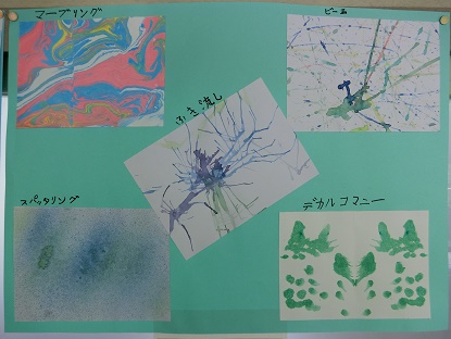 6月9日(月)4年生の教室から 公開日 2025/06/09 更新日 2025/06/09 お知らせ 4年生教室前の廊下に図画工作科「絵の具で夢もよう」の作品が掲示してあります。「マーブリング」「スパッタリング」「デカルコマニー」「吹き流し」「ビー玉」いろいろな技法で表した作品はどれもとても素敵です。