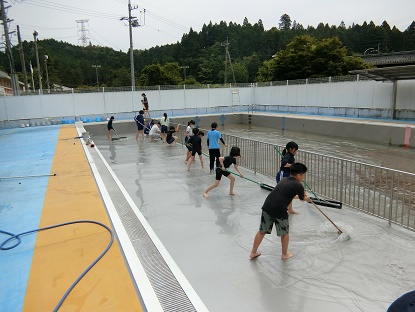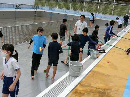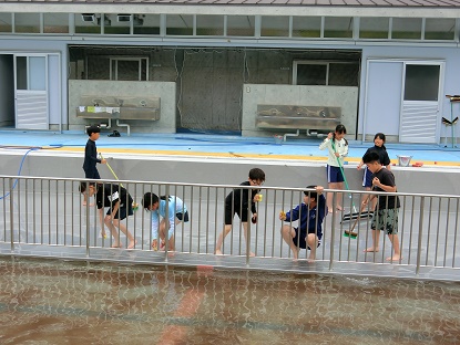 6月9日(月)5・6年生 プール掃除1 公開日 2025/06/09 更新日 2025/06/09 お知らせ 先日、愛校作業で保護者の皆様にプールサイドや更衣室、裏の通路等をきれいにしていただきました。今日は、仕上げとして、5・6年生がプールの中の掃除を行いました。 水位を低くしたプールに入り、デッキブラシでこすったり、手すりをスポンジたわしでこすったりして、全校のために、心を込めて取り組みました。