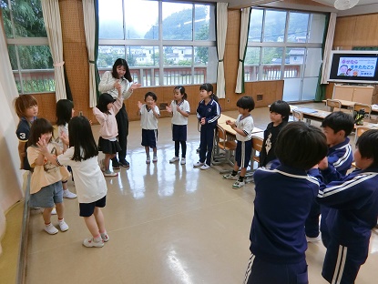 写真上:「しあわせならてをたたこう」の歌を、1番は手をたたく、2番はかたをたたく…とたたく場所を変えながら歌いました。