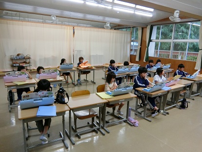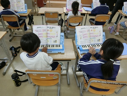 写真中・下:鍵盤ハーモニカの練習です。「どれみふぁそのおととなかよしになりましょう」で「なかよし」という曲の練習をしました。「ド・レ・ミ」「レ・ミ・ファ」「ソ・ファ・ミ・レ・ド・ミ・ド」と指番号に合わせて運指を正しく演奏します。1年生も、はじめの「ド」の位置を確認して、リズムに合わせて演奏していました。