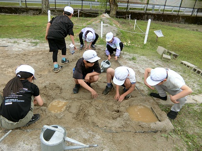 6月12日(木)休み時間の様子 公開日 2025/06/12 更新日 2025/06/12 お知らせ 写真上:丸池では、オタマジャクシがずいぶん大きくなってきました。頭が子どもたちの親指の先くらいの大きさのものや、足が生えてきたものもいます。「カエルの大合唱」も近いかもしれません。 写真中:4年生は、雨でたまった水を使って、砂場でダムや山を作って楽しんでいました。 写真下:鬼ごっこは学年をまたいで人気です。上級生がさりげなく加減をしているところが微笑ましいです。