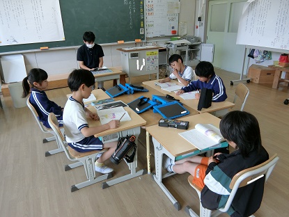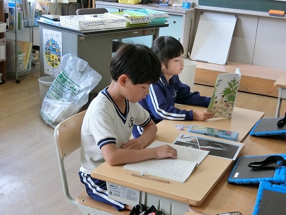 国語科「名前を見てちょうだい」の学習の様子です。教材文を1ページずつ交代で音読しています。会話文では、登場人物の気持ちを考えて、感情をこめて読んでいました。