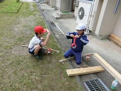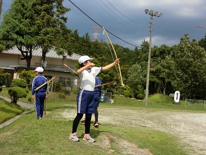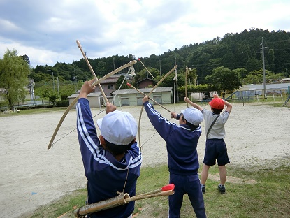 ふるさと学習の一環で進めてきた、弓矢づくり。矢を入れる竹筒まで装備し、本格的です。家に持ち帰る前に、「遠くまで飛ばす」「的に当てる」大会を行うようです。みんな自分の弓矢への愛着があり、大切に扱っていました。