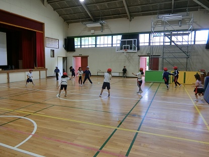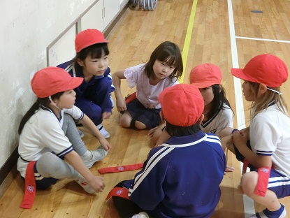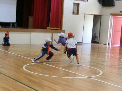 体育科「タグラグビー」の様子です。何度か行っているので、みんなずいぶん攻防のかけ引きが上手になってきました。チームで作戦を立てたり、残っている仲間に声援を送ったりして、盛り上がりました。