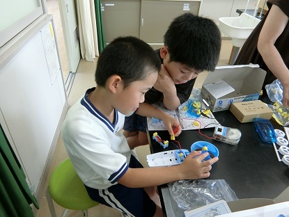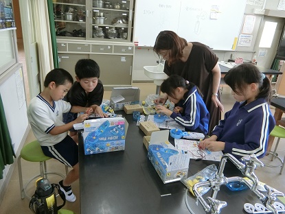 6月16日(月)4年生 今日の様子 公開日 2025/06/16 更新日 2025/06/16 お知らせ 理科「電池のはたらき」で製作していた「ハンディファン」が出来上がりました。(よくがんばりました!)説明書を確認しながら配線し、ファンがしっかり回るかどうか確認した後は、電池の数やつなぎ方(直列・並列)によって、電流の大きさがどのように変わるかを簡易検流計を使って、調べました。