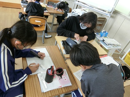 算数科「分数×分数」で、分数で表された時間について調べる学習をしています。「4分の3時間は何分ですか」という問題の解き方について、図をかいて考えたり、式に表したり、言葉で解説したりしながら、個々に取り組んでいました。