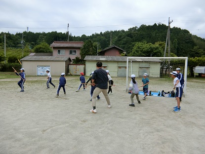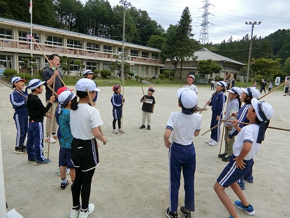 毎週火曜日の朝活動は、全校棒の手練習です。今日は初めて外で練習することができました。流派ごとに大きな声であいさつをして、練習開始です。低学年の児童も動きを覚え、少しずつ型の完成度を高めていました。