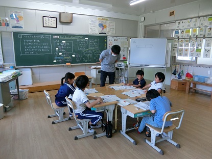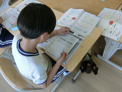 算数科「見方・考え方を ふかめよう(1)」で、加減の場面における文章問題を、図と式を使って考えます。図に表すことで、たし算で求めるのか、ひき算で求めるのか、分かりやすくなります。ノートに自分で図をかき、じっくりと問題に取り組んでいました。