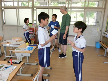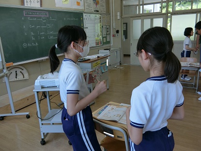 外国語科「できることを伝え合おう」の授業の様子です。それぞれ自分の名前と「できること」を1つカードに書き、友達と会話練習をします。相手の「できそうなこと」を予想して「Can you 〜?」と質問します。質問された児童は、カードに書いたことと合っていれば「Yes,I can」違っていれば「No,I can't」と答えます。よく知っている仲間なので、得意なこともよく知っているようですね。