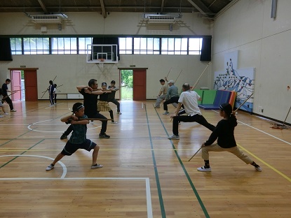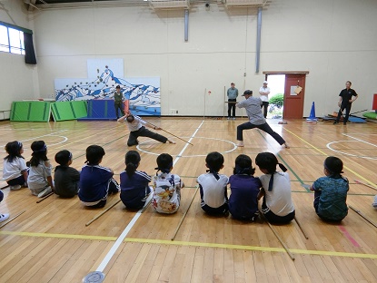 各流派に分かれて練習開始です。模範演技もご披露いただき、「本物」の動きに子どもたちも釘付けでした。