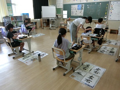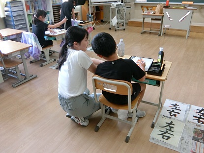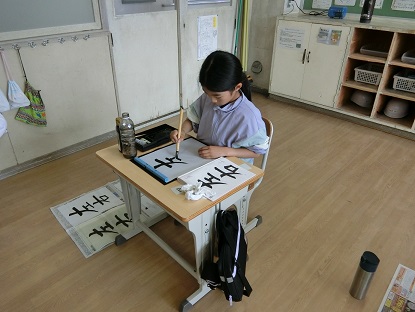 7月1日(火)4年生 今日の様子 公開日 2025/07/01 更新日 2025/07/01 お知らせ 書写の様子です。筆順と字形の関係に気を付けて「左右」の練習をしています。同じ「横画」と「左はらい」のある字ですが、「左」は一画目は横画、「右」は一画目ははらいです。横画と左はらいが交わるときには先に書いた画が短くなります。 手本をよく見て、一画ずつ丁寧に書いていました。いい字が書けましたね。