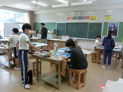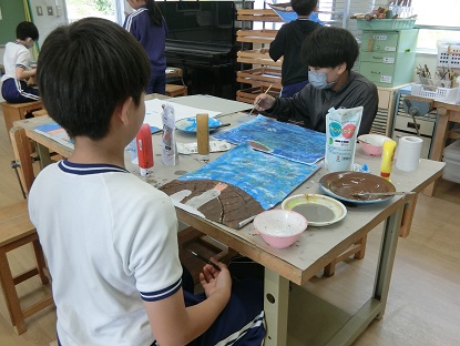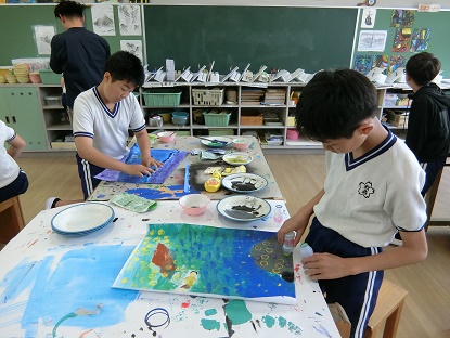 7月1日(火)6年生 今日の様子 公開日 2025/07/01 更新日 2025/07/01 お知らせ 図画工作科で進めてきた「海のいのち」の絵画制作が仕上げに入ってきました。容器の口でスタンピングをしたり絵の具に砂糖を混ぜて「ざらざら」「ごつごつ」した感じを出したりと、個々に工夫を凝らしていました。力作ぞろいです。