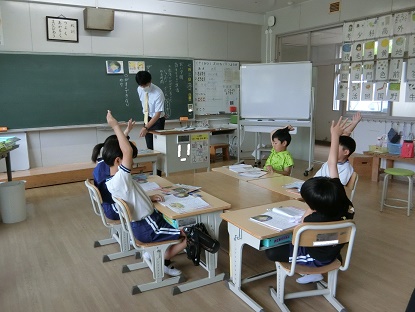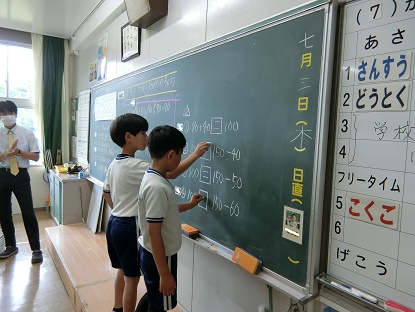 写真上・中:算数科 等号(=)や不等号(<、>)を使って式に表す学習をしています。