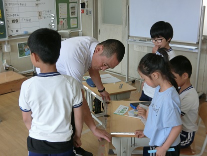 写真下:理科「ゴムと風の力のはたらき」でプロペラで走る車をつくっています。