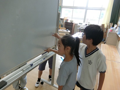 写真上・中:算数科「体ばかりを使って長さをはかろう」 自分の体を使って、いろいろなもののおおよその長さを測り、実測との誤差を競っています。