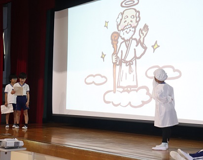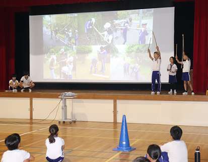 7月7日(月)全校朝会の様子 公開日 2025/07/07 更新日 2025/07/07 お知らせ 3年生が「ふるさと学習」(総合的な学習の時間)で神明神社について調べたり見学したりインタビューをしたりして学んだことを発表しました。 見学の様子を劇にしたり、分かったことをクイズにしたり、自作の弓矢の試技を披露したりして、他学年も楽しく参加することができました。