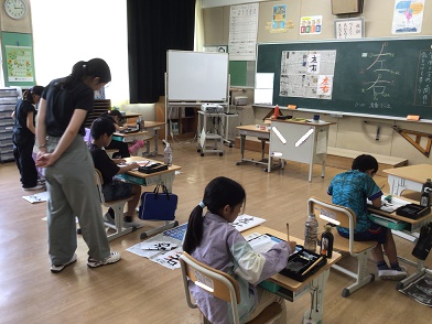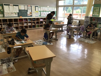 書写の授業の様子です。手本をよく見て「左右」の練習をしています。前回よりみんなとても上手に書けていました。