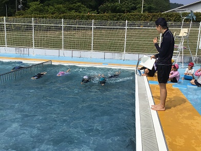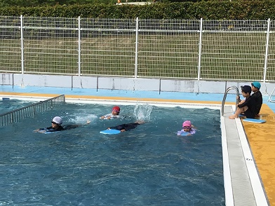 水泳の授業の様子です今日は、けのびや泳力の検定も行っていました。回を重ねるごとに、上達し、自信をつけている1・2年生です。