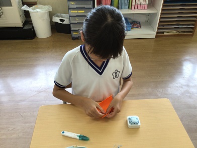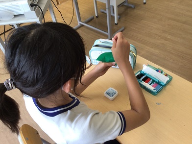 家庭科「ひと針に心をこめて」の授業の様子です。裁縫セットの中にあるものの名前や使い方を習いました。まずは「玉どめ、玉結び」に挑戦です。これができないと、糸が抜けてしまいます。「ああ〜」「いかん!」などの悲鳴(?)が聞かれながらも、みんな熱心に取り組んでいました。作品作りが楽しみですね。