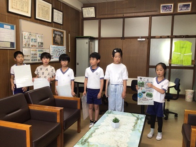 ふるさと学習(総合的な学習の時間)でお須原山へ見学に行き、そこで見つけたさらに調べたいことについてそれぞれ調べ、まとめたことを校長室に報告に来てくれました。