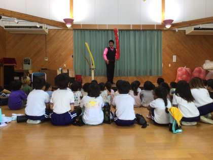 本日は、杉本こども園で大道芸人の「ゆうじ」さんによる、バルーン体験が行われ、1・2年生がご招待を受け、参加してきました。