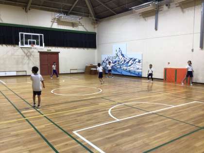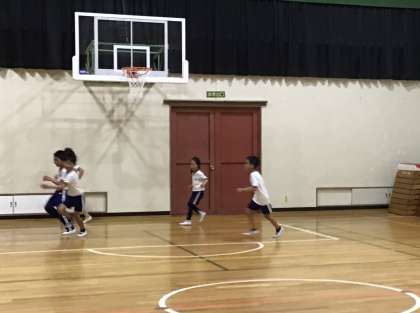 お楽しみ会で「色おに」をしています。体育館の中になかなか見当たらない色も、工夫を凝らして(?)楽しんでいました。