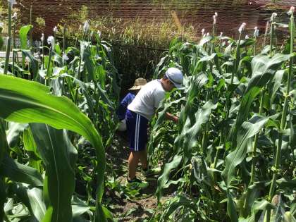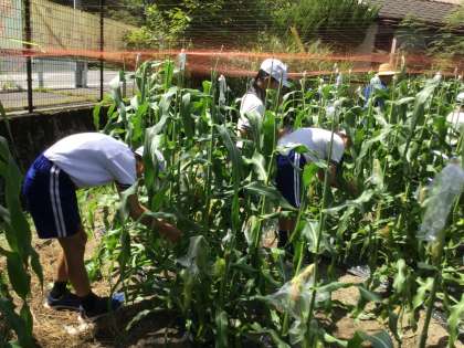 運動場の南側で栽培している、トウモロコシの世話をしています。今日は、少しずつ大きくなってきた実に、一つずつネットをかぶせていきました。6年生が丹精込めて世話をしてくれたトウモロコシ。ここから大きく実っていくのが楽しみです。ありがとう。