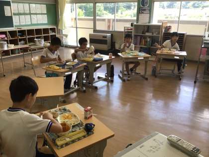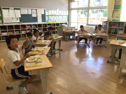 久しぶりの給食。「おいしいですか?」「(サムズアップポーズ)」